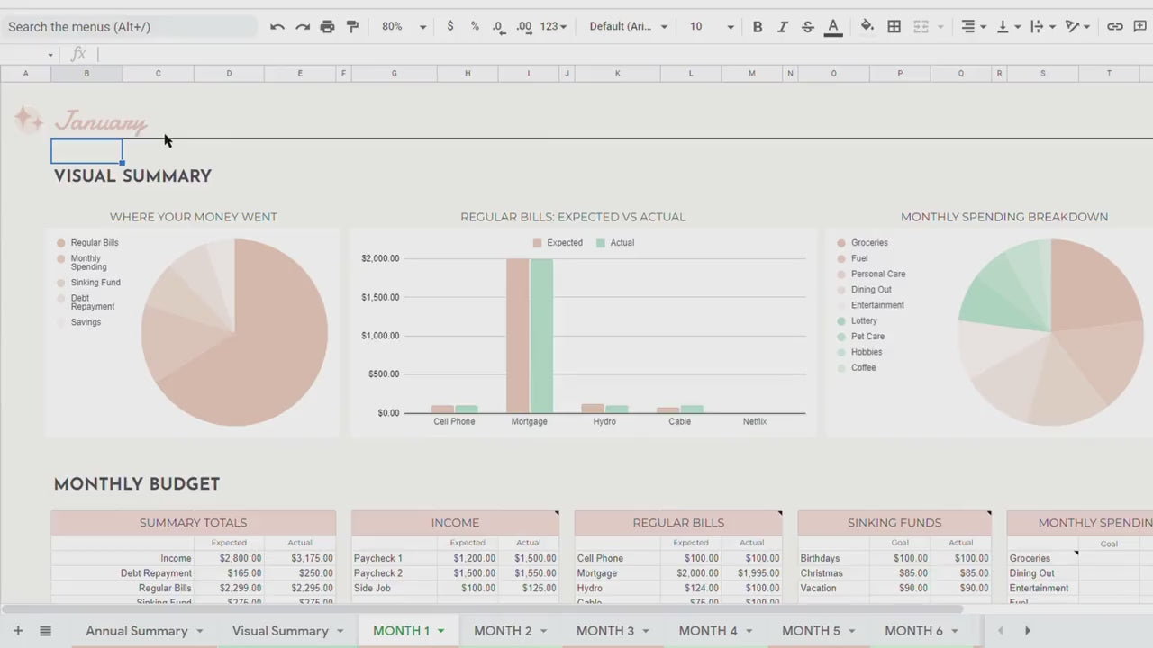 • 12 monthly budgets each with a variable expense tracker and zero-based budget calculator