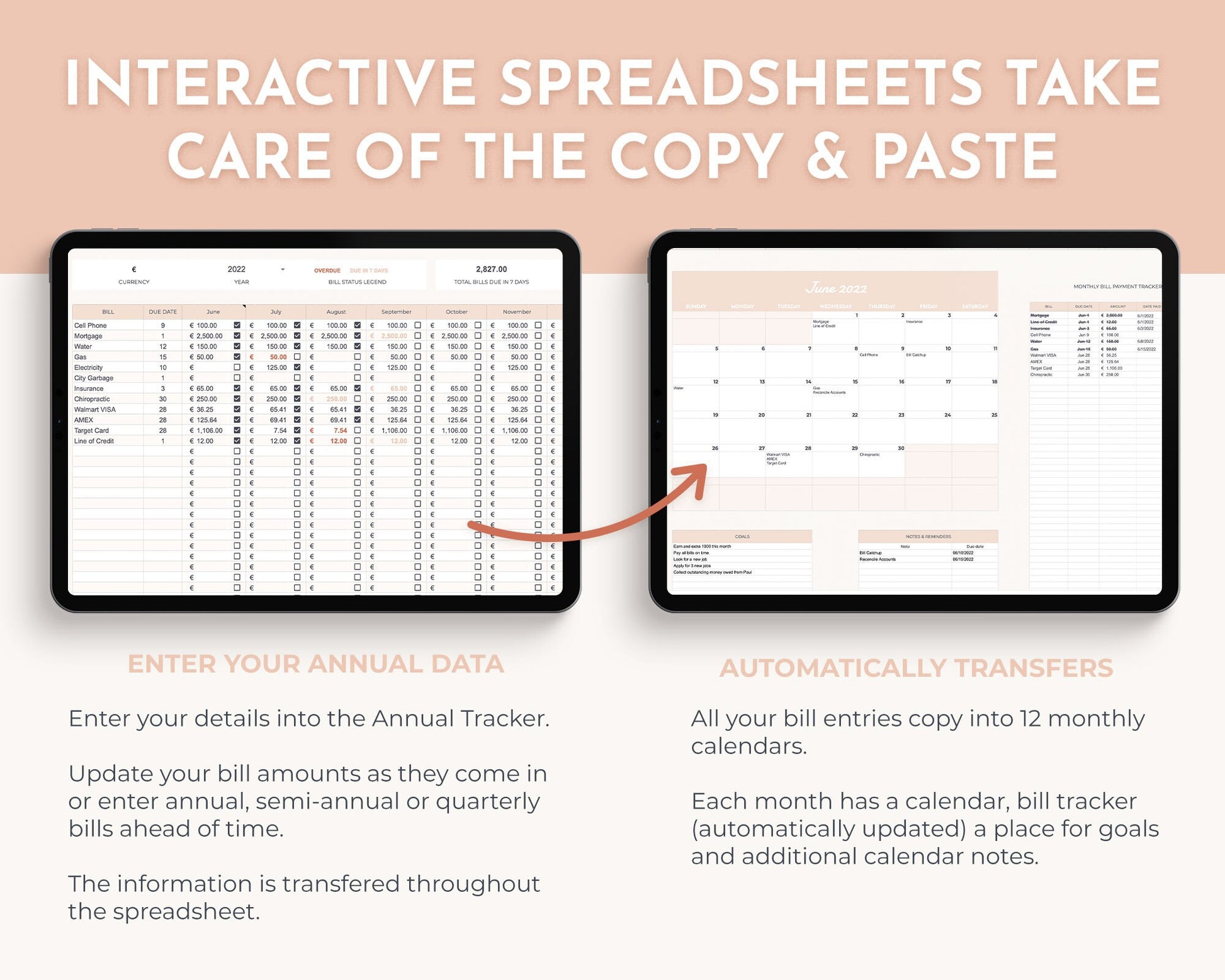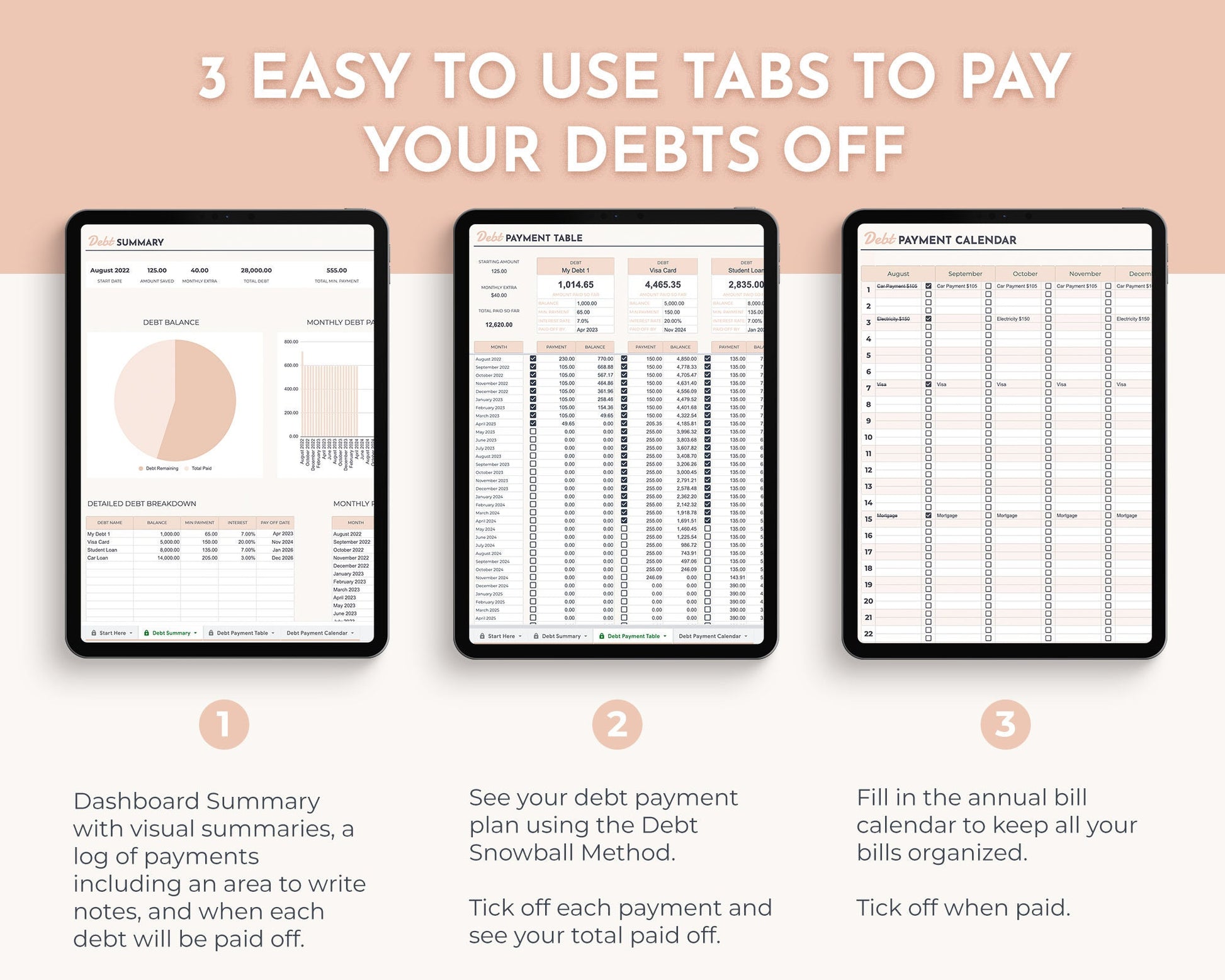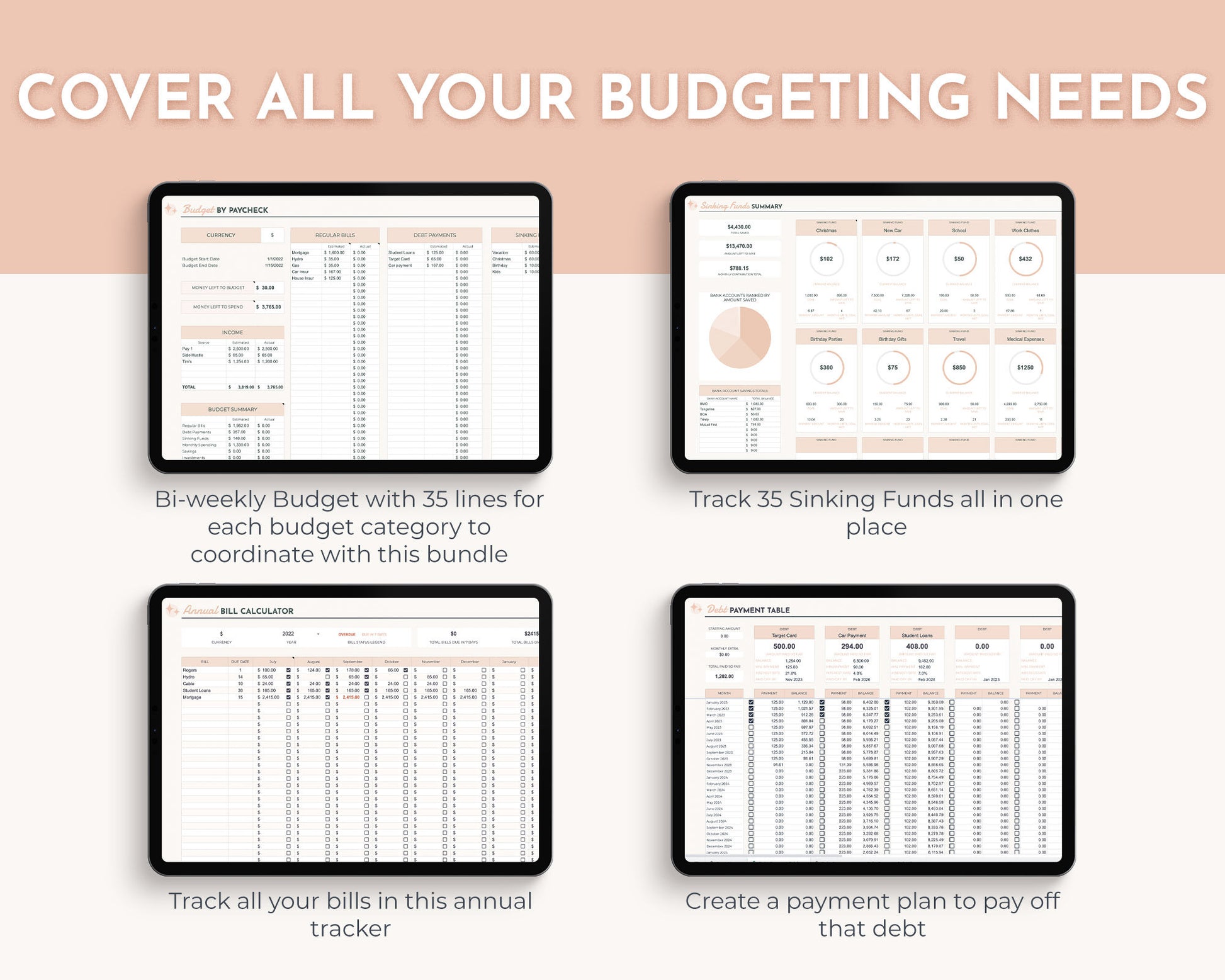 a Biweekly Paycheck Budget, Debt Payoff Tracker, Sinking Funds Tracker and an Annual Bill Tracker for all your expenses.