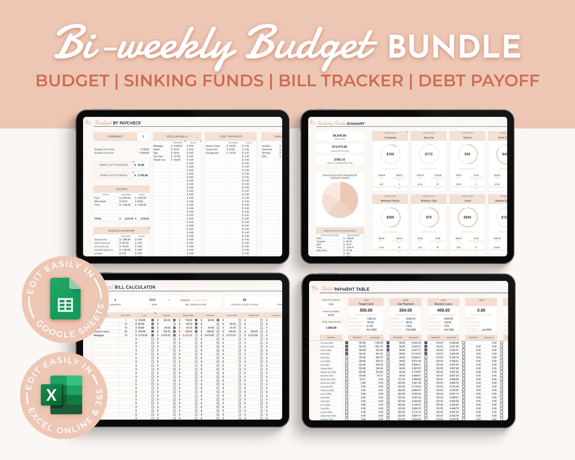Cover all your budgeting needs with this Biweekly Paycheck Budget All in one Spreadsheet Bundle for Excel and Google Sheets.