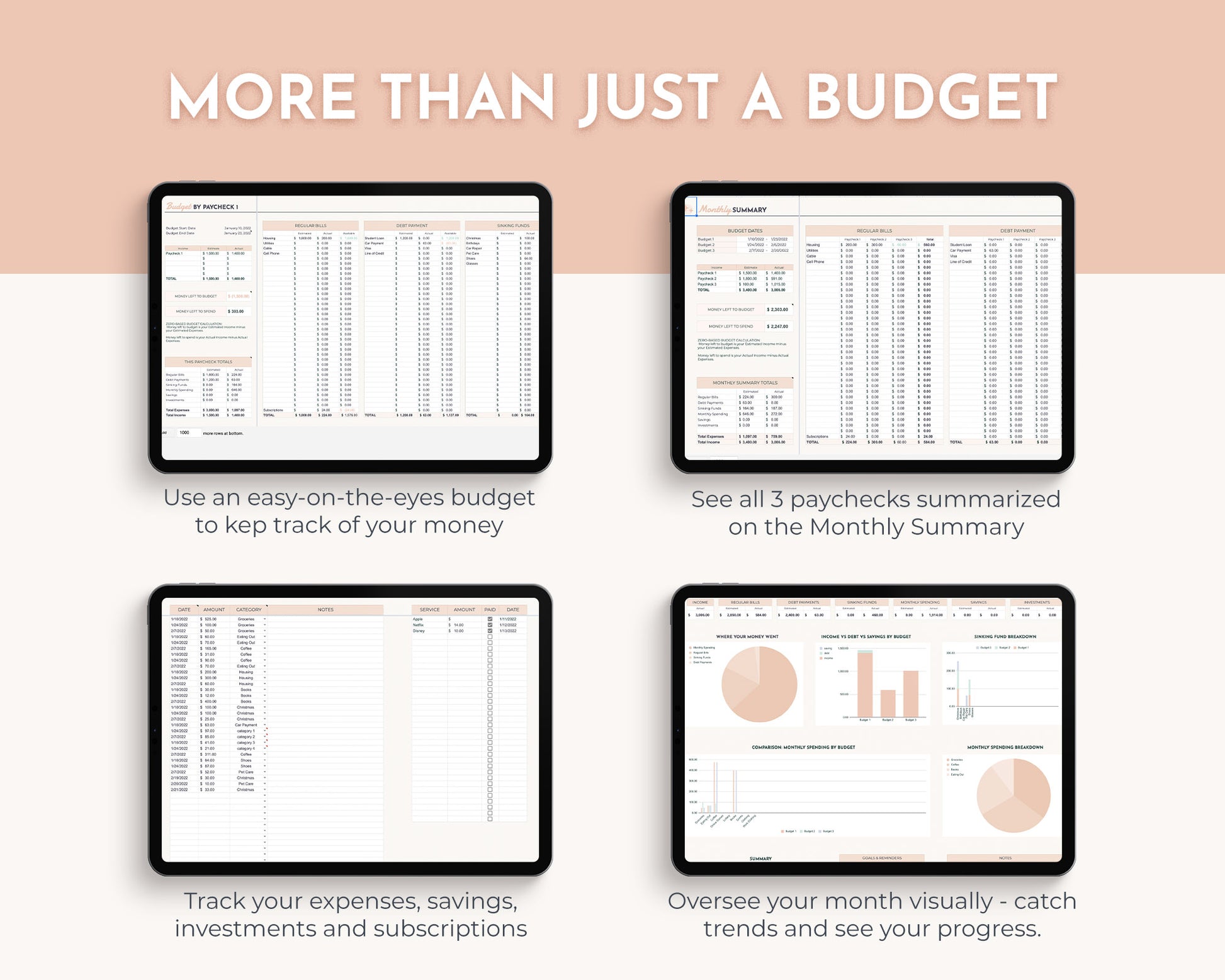 Designed with Google Sheets and Excel, this budget spreadsheet has 3 budgets to cover your bi-weekly paydays.