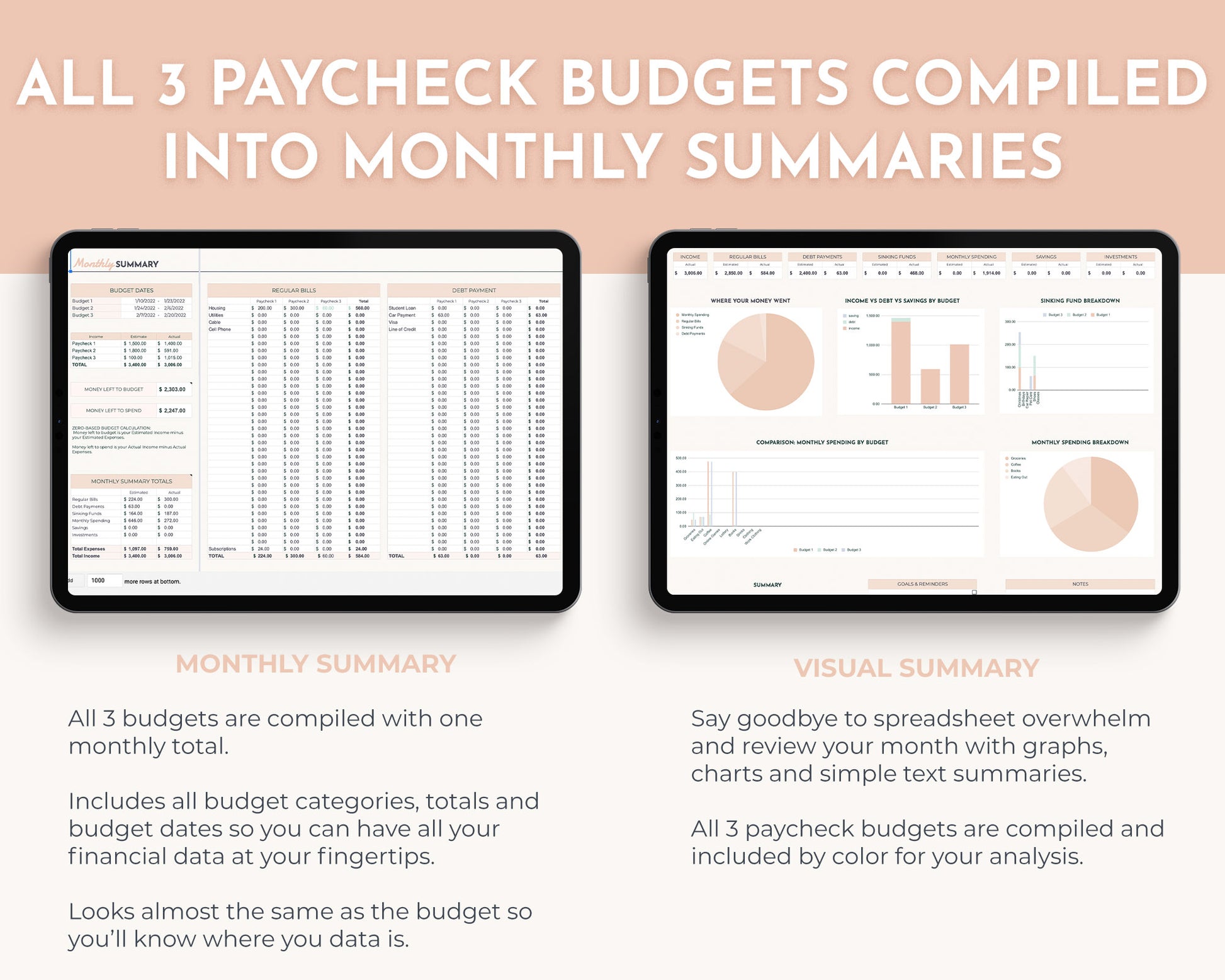 • Tab 6: Monthly Summary with all 3 paycheck budgets complied to show you your month.