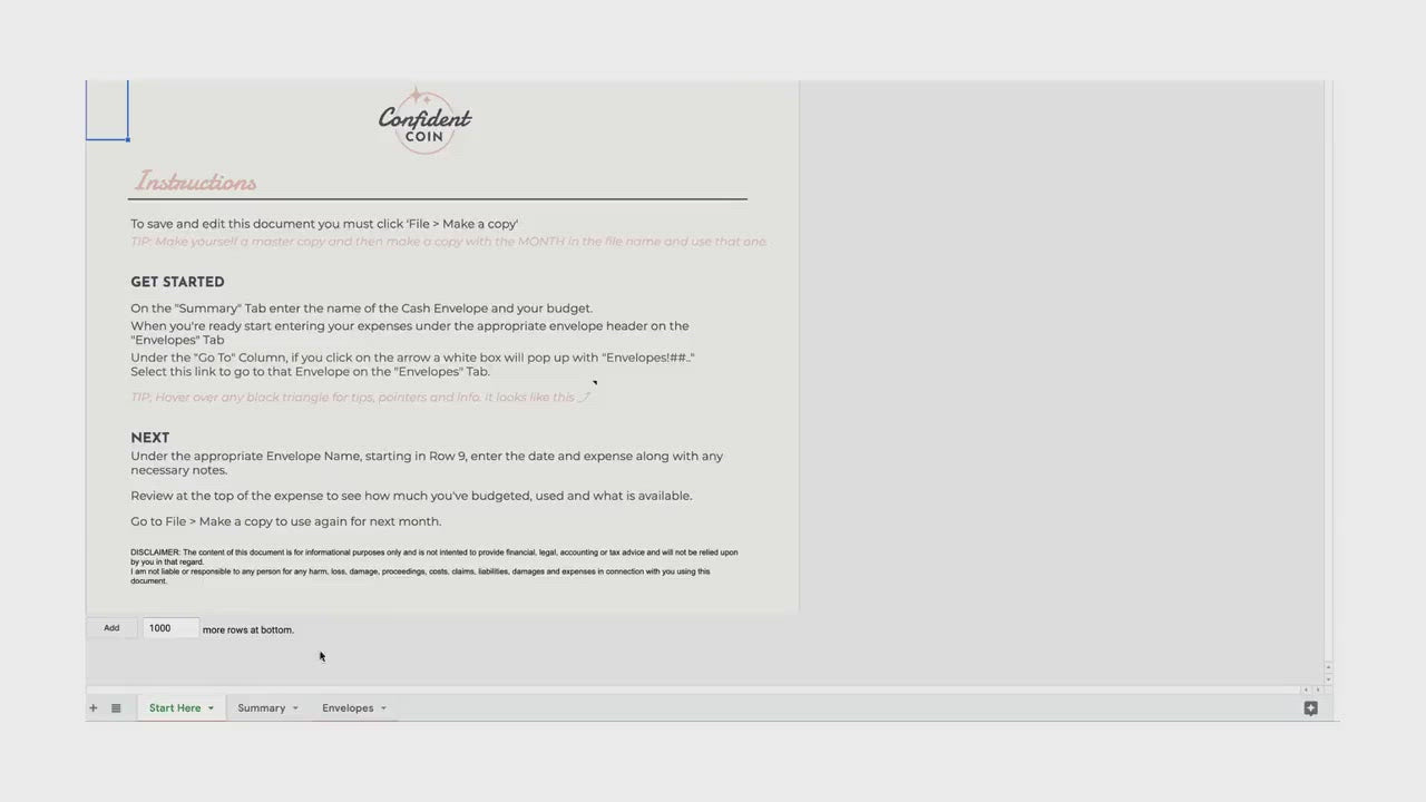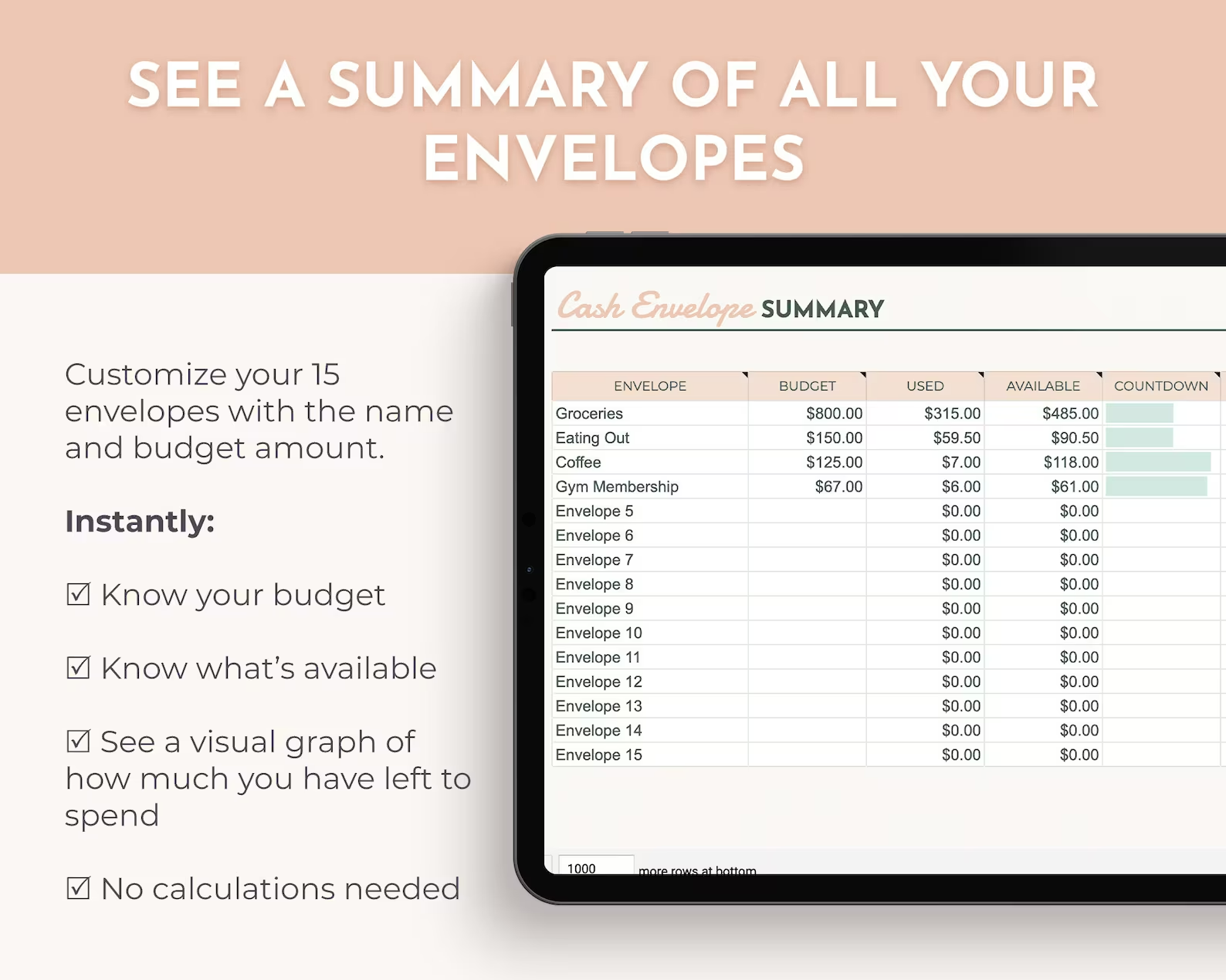 Done for you google spreadsheet with quick start details. Up to 15 Envelopes on one sheet (need more? just ask!)