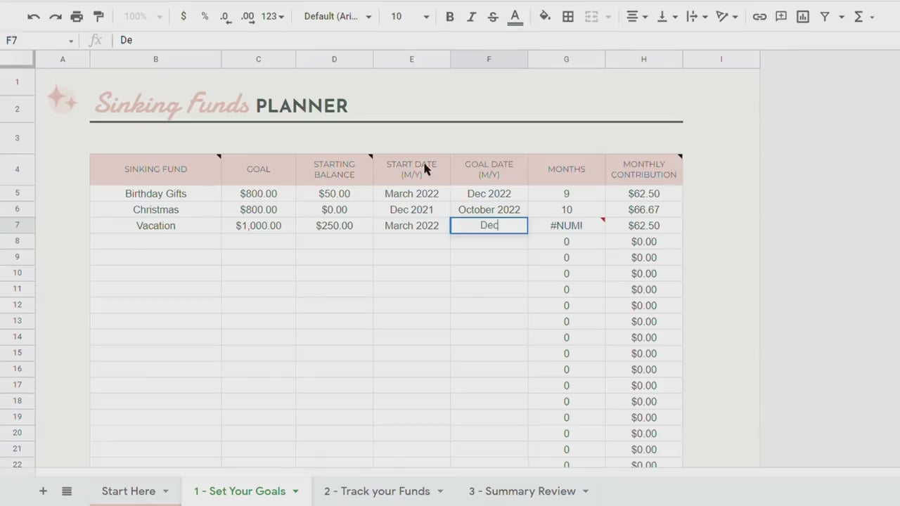 • Tab 2: Sinking Funds Planner where you decide how much you need to save and the planner tells you how much to put away each month (no math required!)
