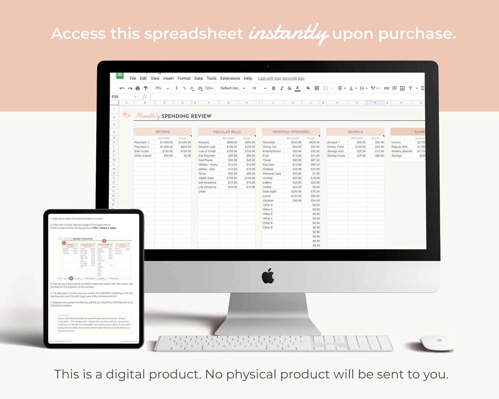 • Once you purchase the listing, you will download a PDF file. Included in the PDF is a link to access the Monthly Budget Google Spreadsheet
