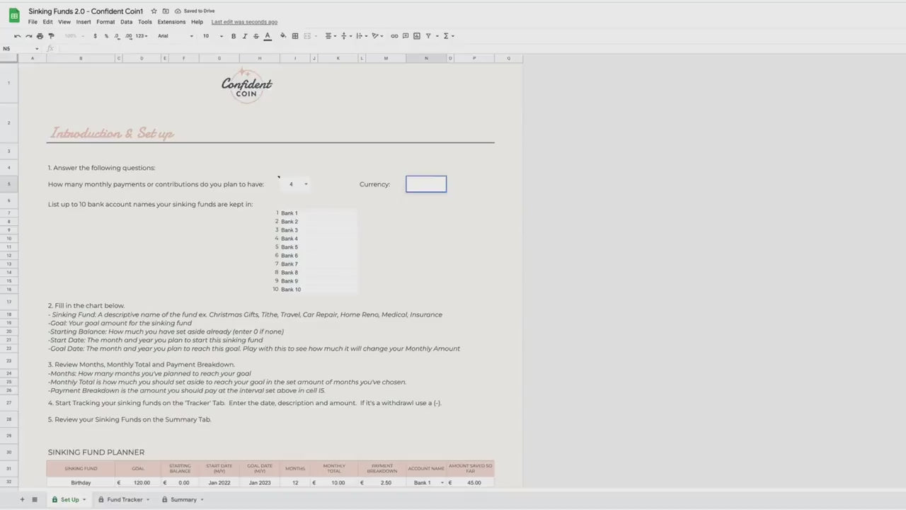 - Tab 2: Sinking Funds Tracker to track each funds deposits and withdrawls