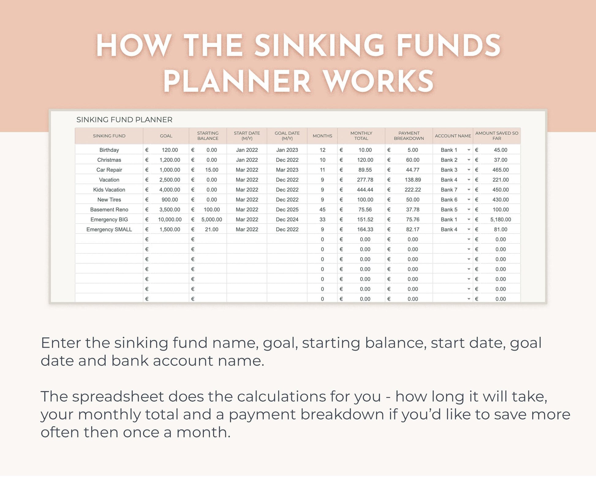 All the math is done for you - no calculations. AND! This sinking funds planner includes a bank account summary so that you can see how much money should be in your accounts for each sinking fund.