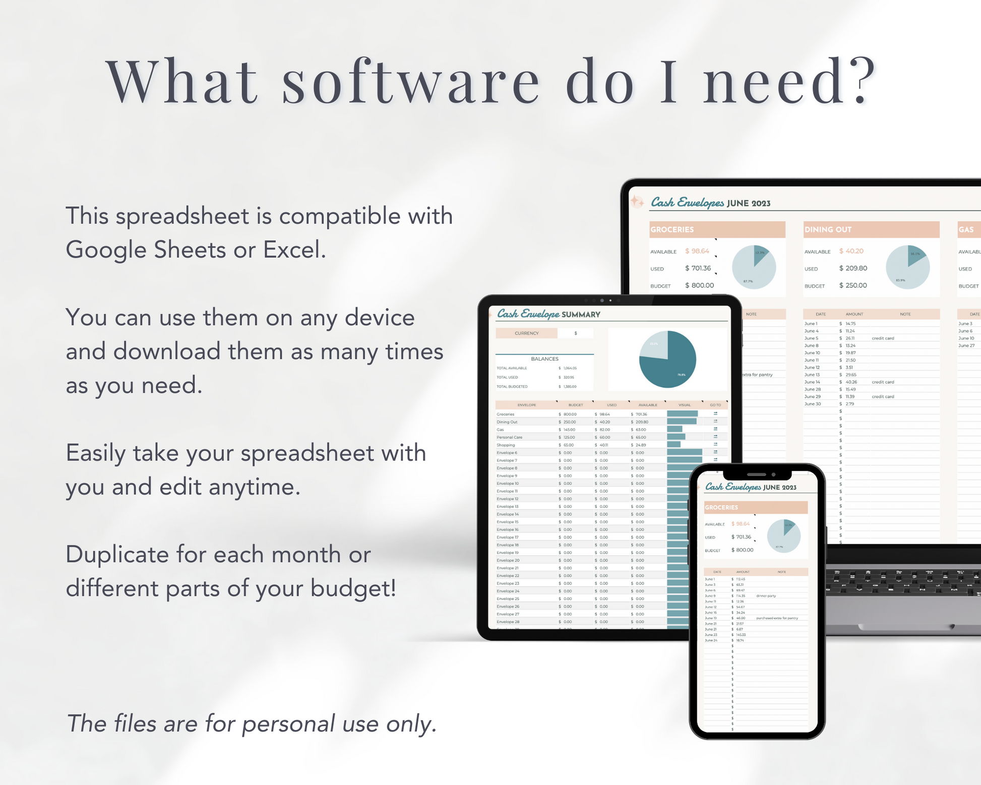 Our Google Sheets spreadsheets use Google Sheets which is access through a FREE Google Account and our Excel spreadsheets (coming soon) are used with Microsoft Excel.