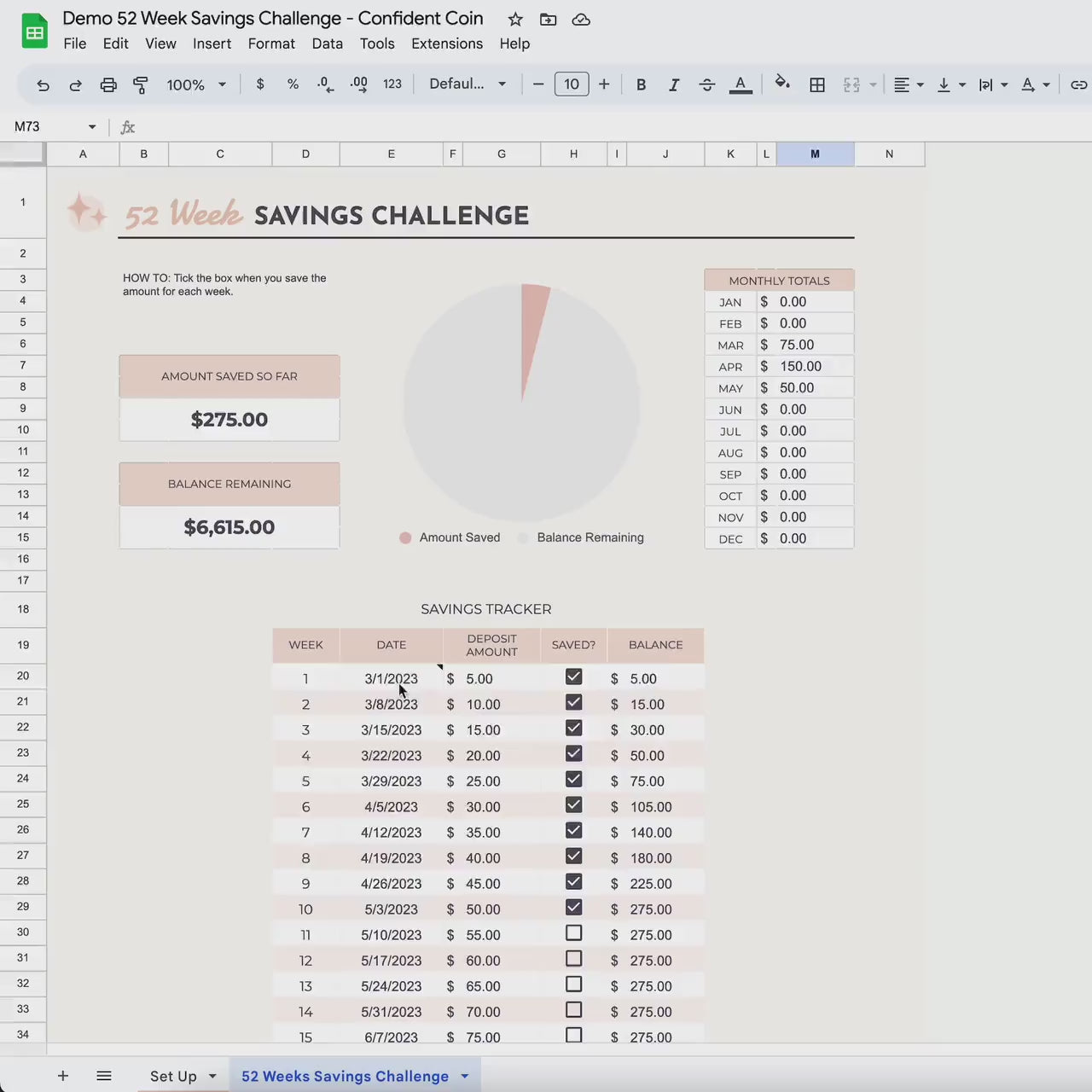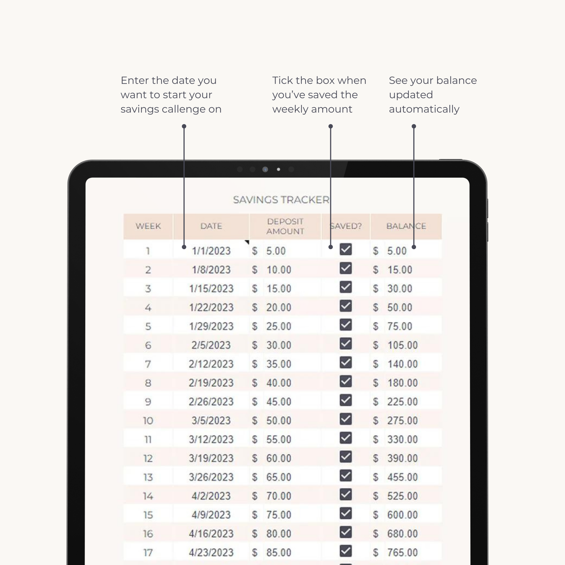 Use 52 envelopes or virtually with your bank account. Start with $5 the first week and double your amount to save up to $6900 in just 52 weeks.