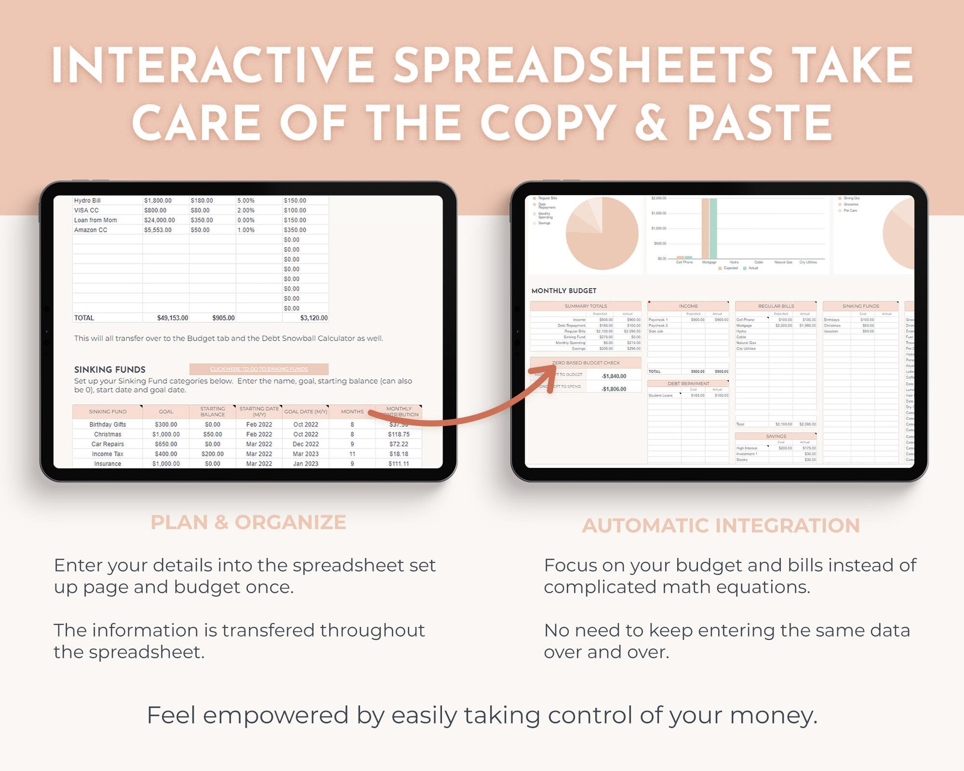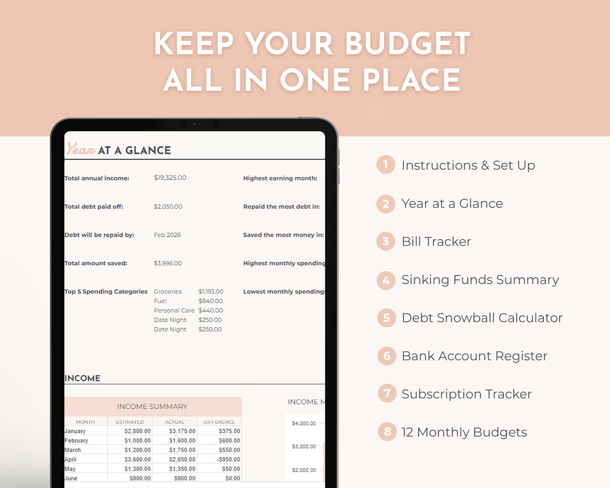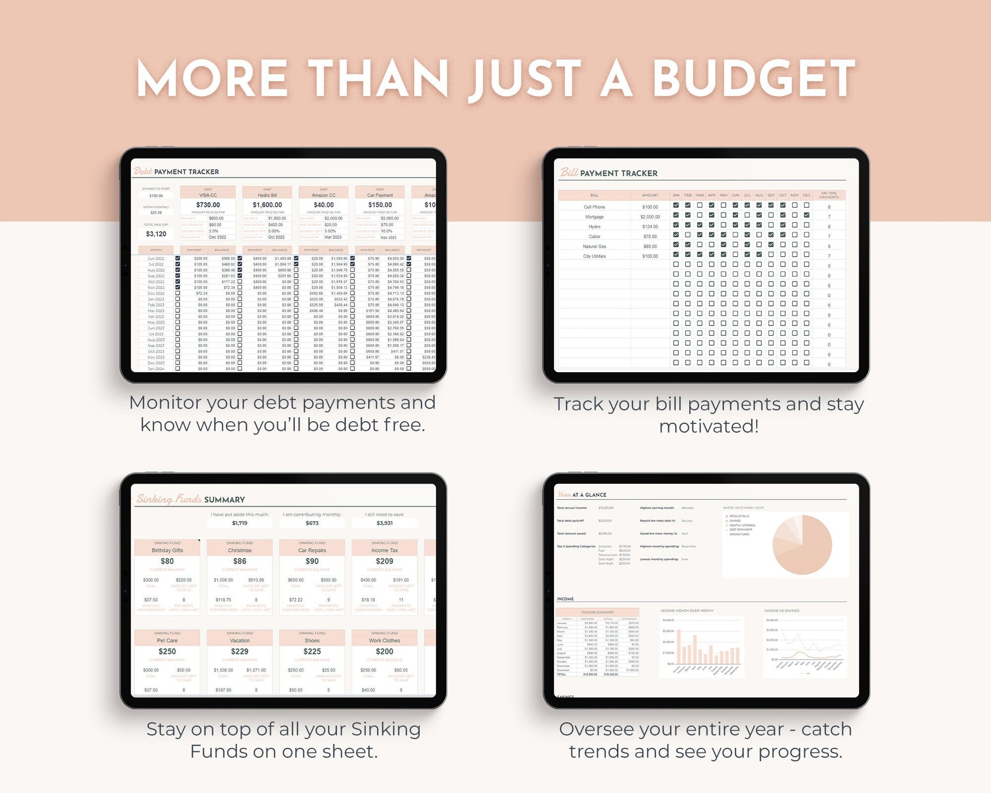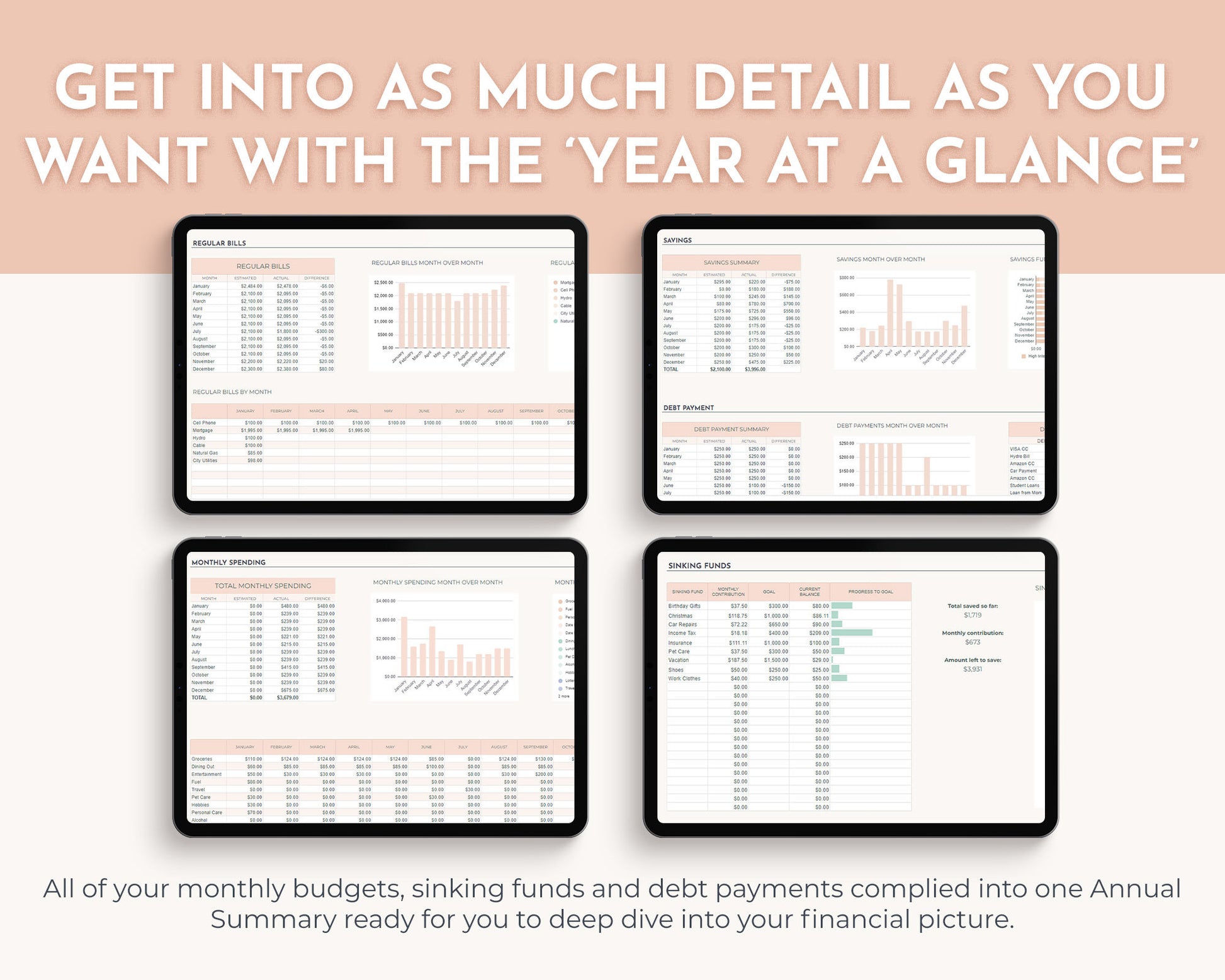 Along with 12 powerful monthly budgets, it has interactive Sinking Funds, Debt Tracker, Bill Tracker, Bank Account Tracker, Subscriptions, and an Annual Year at a Glance Spreadsheet.