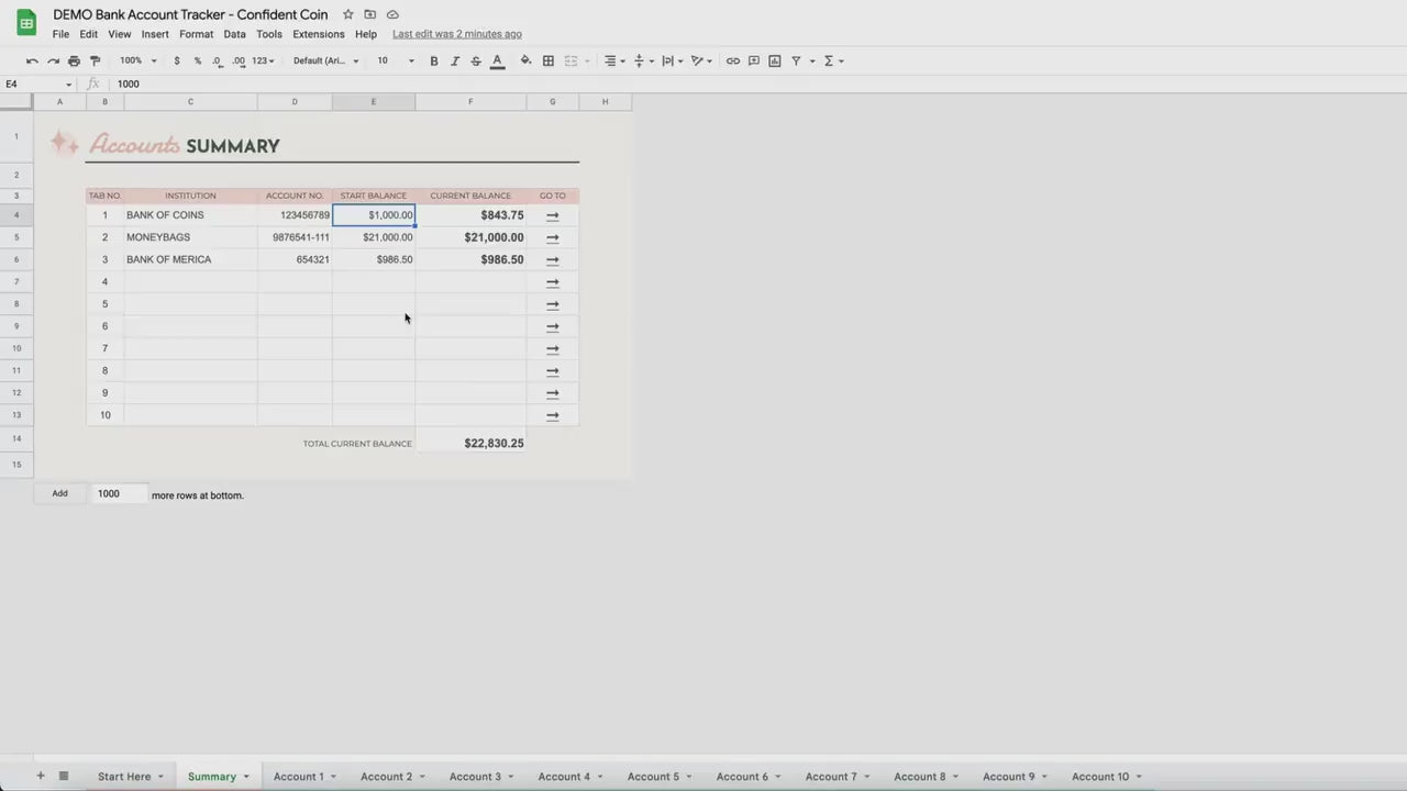 • Tab 2: Accounts Summary. All the info copies over to each account. Includes a quick link to jump to each specific envelope (no side scrolling!)