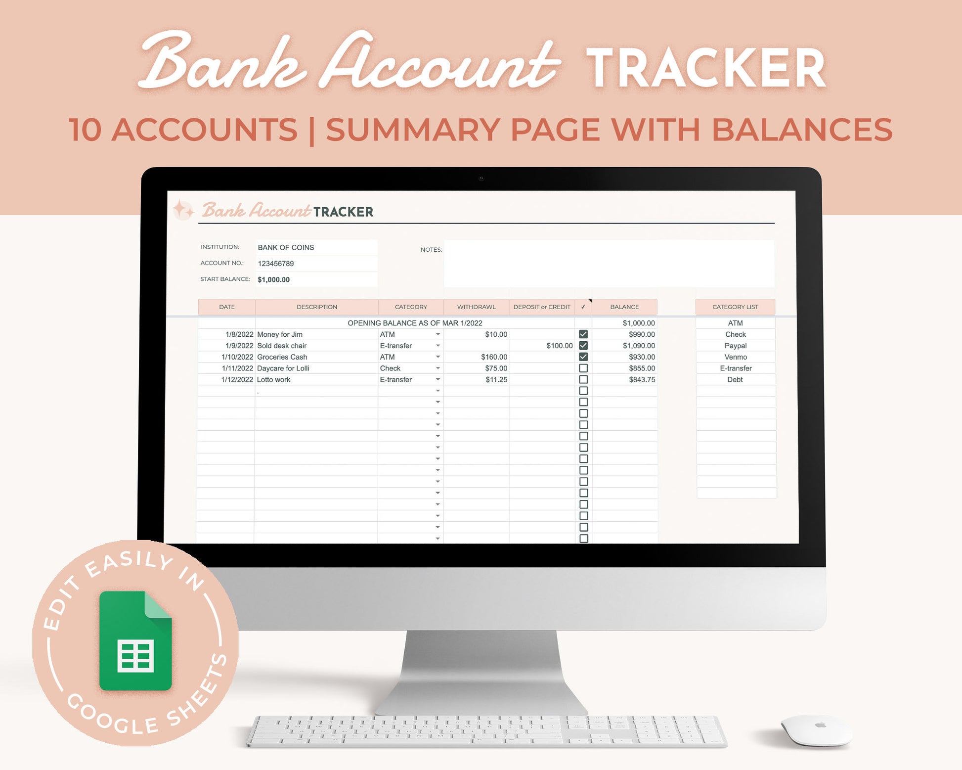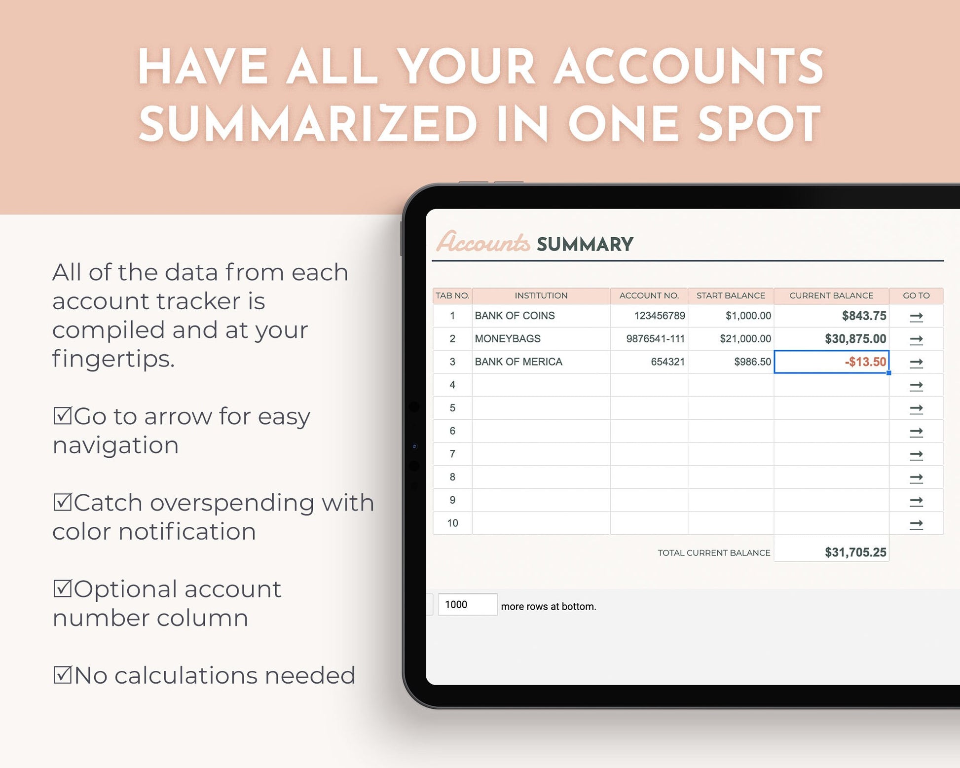 The spreadsheet has a summary page where you can easily see your balances and jump to each account.