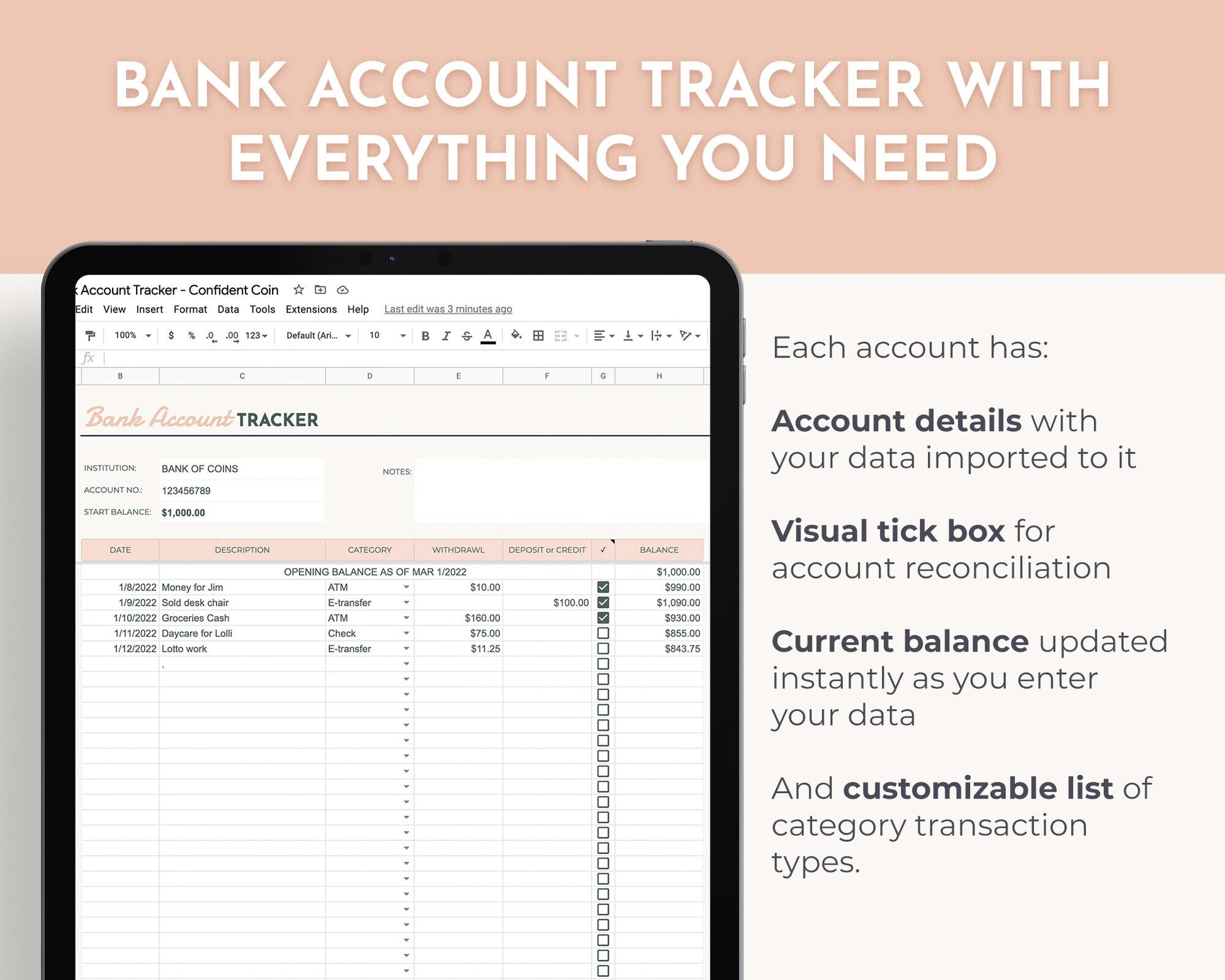 • Tab 3+: 10 Account Registers with a tick box for reconciliation, and auto calculations for your current balance.