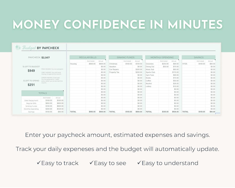 Plan out your Paycheck with a Budget by Paycheck Google Sheet. Designed to boost your money confidence with ease, now in GREEN!