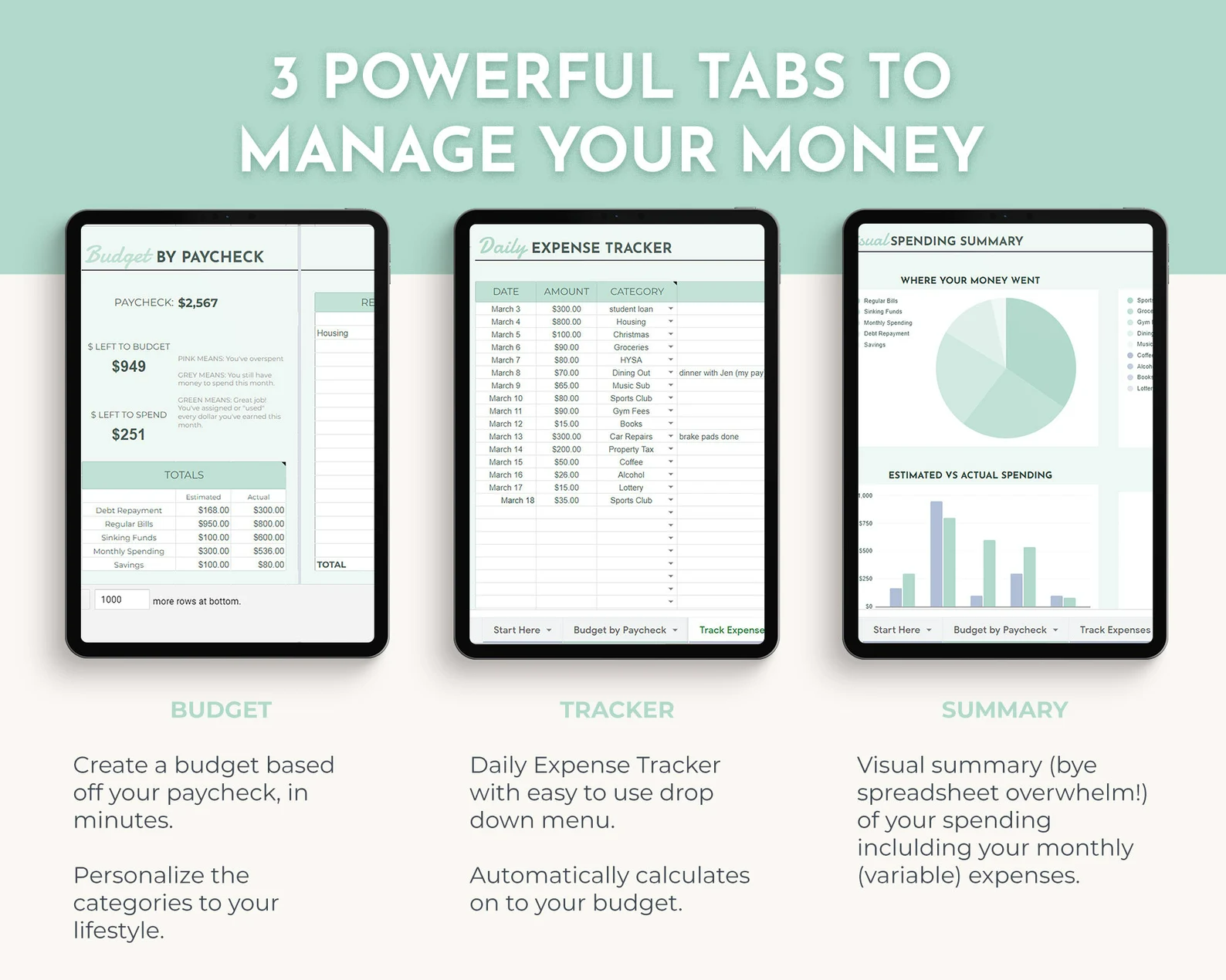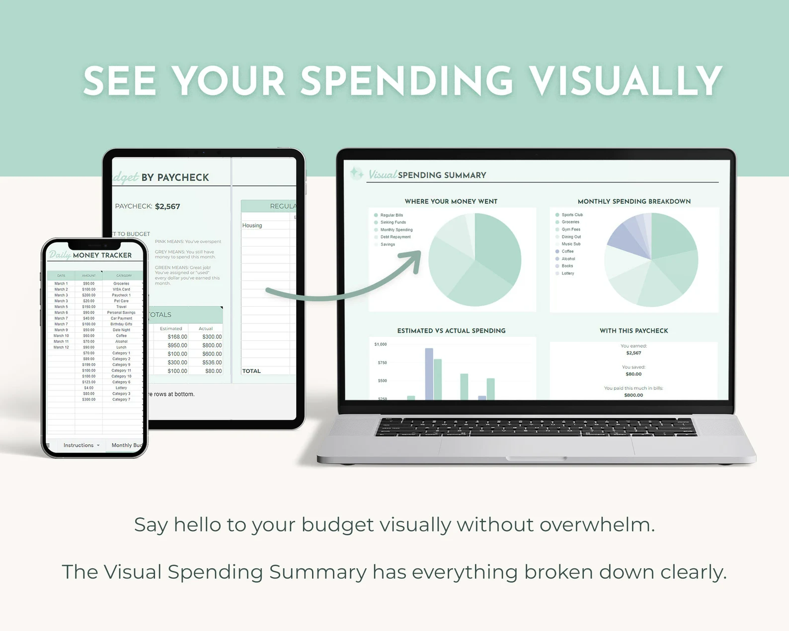• Tab 3: Visual summary of your spending for your paycheck. Ditch the number overwhelm and "see" your budget in a new way.