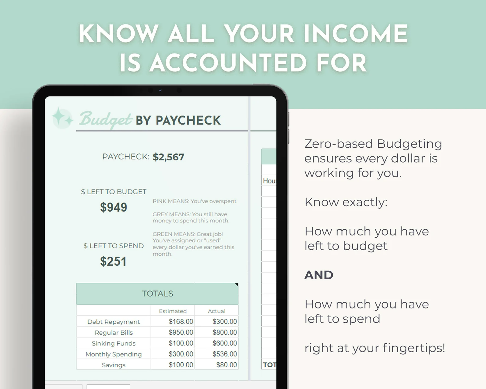 • 3 tabs to track your income, spending and savings with a zero-based budget.