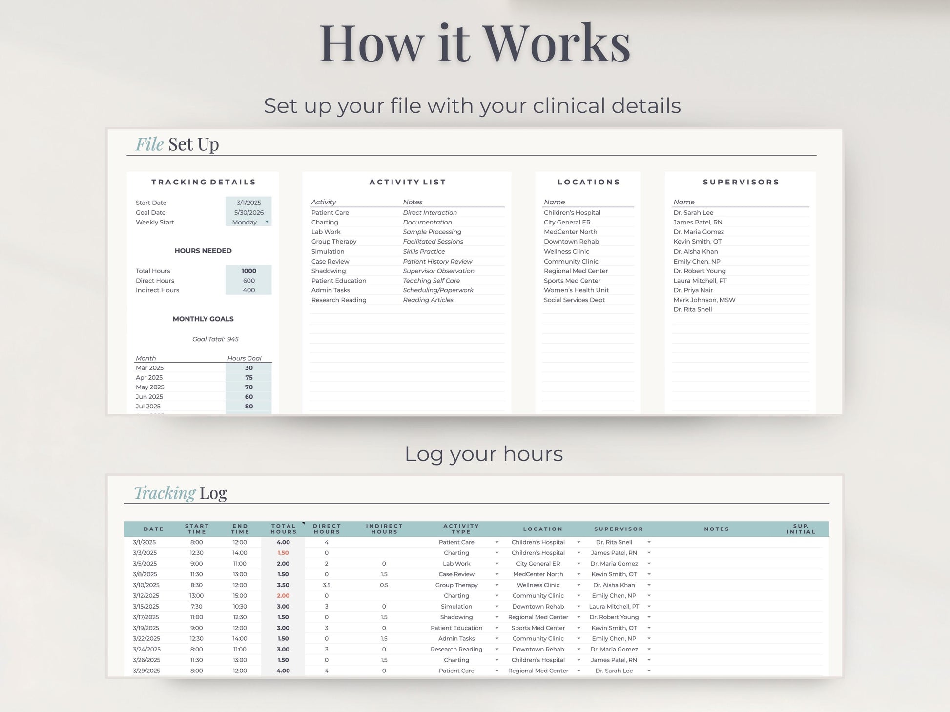Clinical Hours Tracker for Social Work & Nursing Supervision Log Google Sheets & Excel