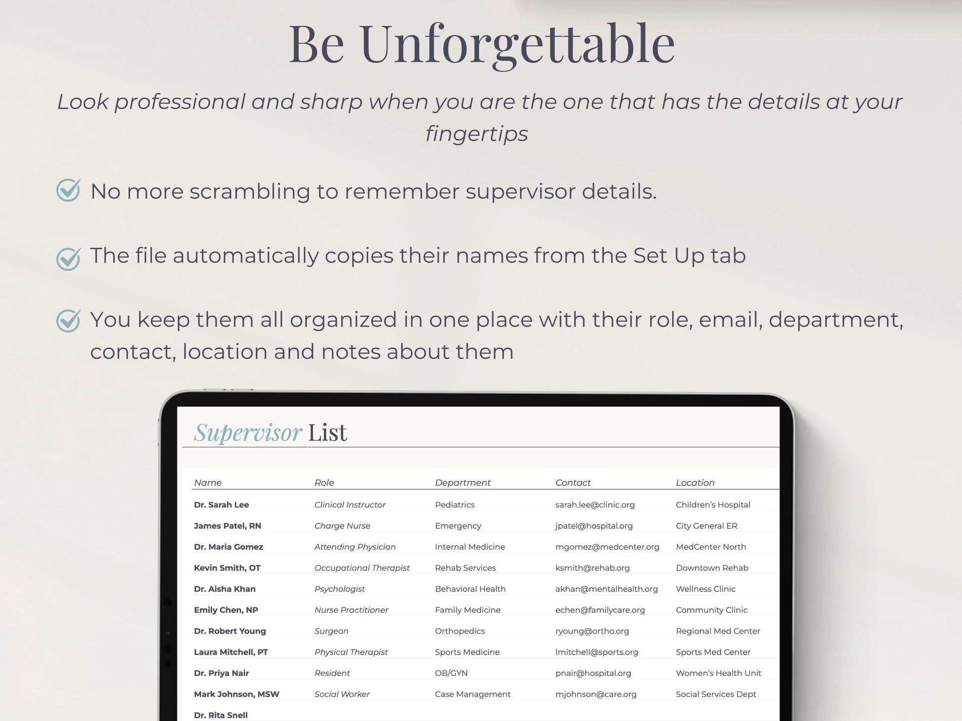 5. Supervisor List: A detailed list of all your supervisors so you can stay focused on what matters during your clinical work