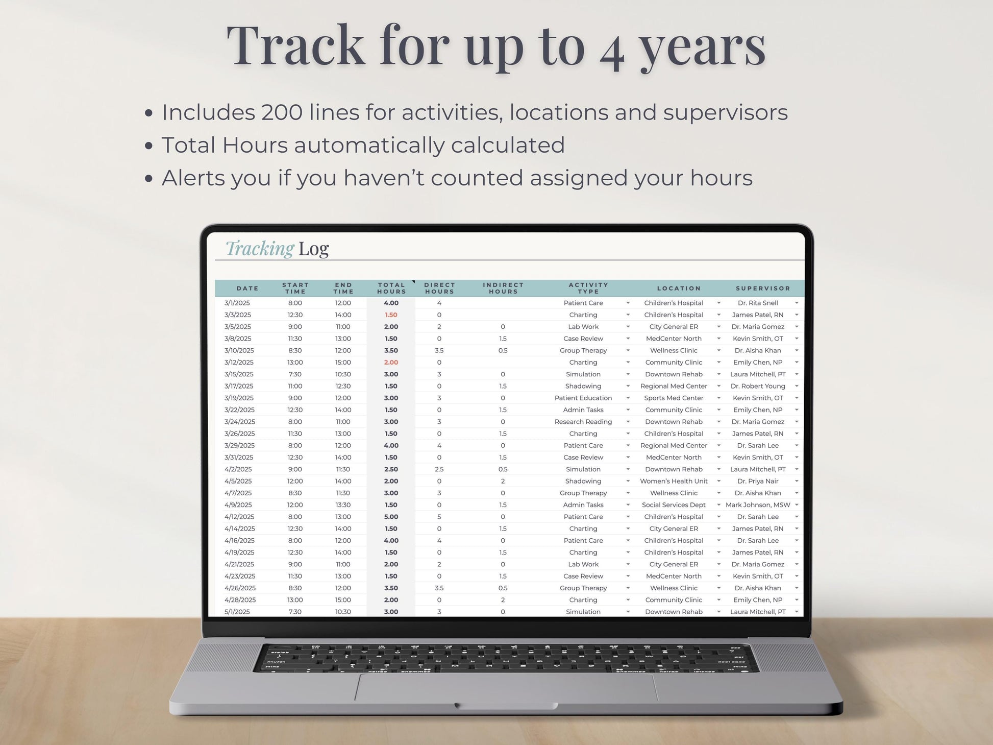No more messy notes or last-minute scrambling , this tracker keeps all your hours in one place so you can focus on your learning instead of worrying about the paperwork.