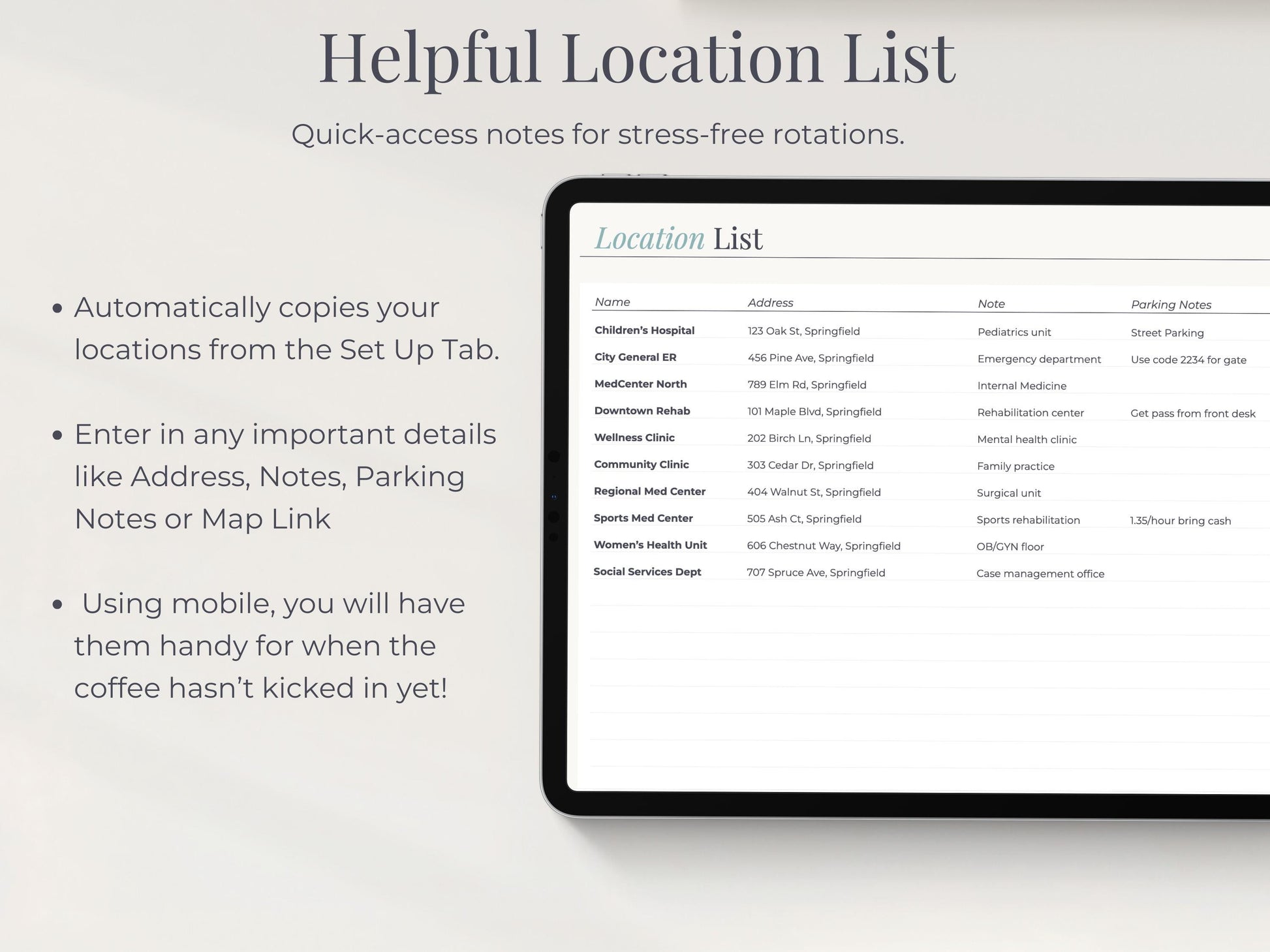 4. Location List: A list of your locations with details so you can stay sharp before the coffee kicks in