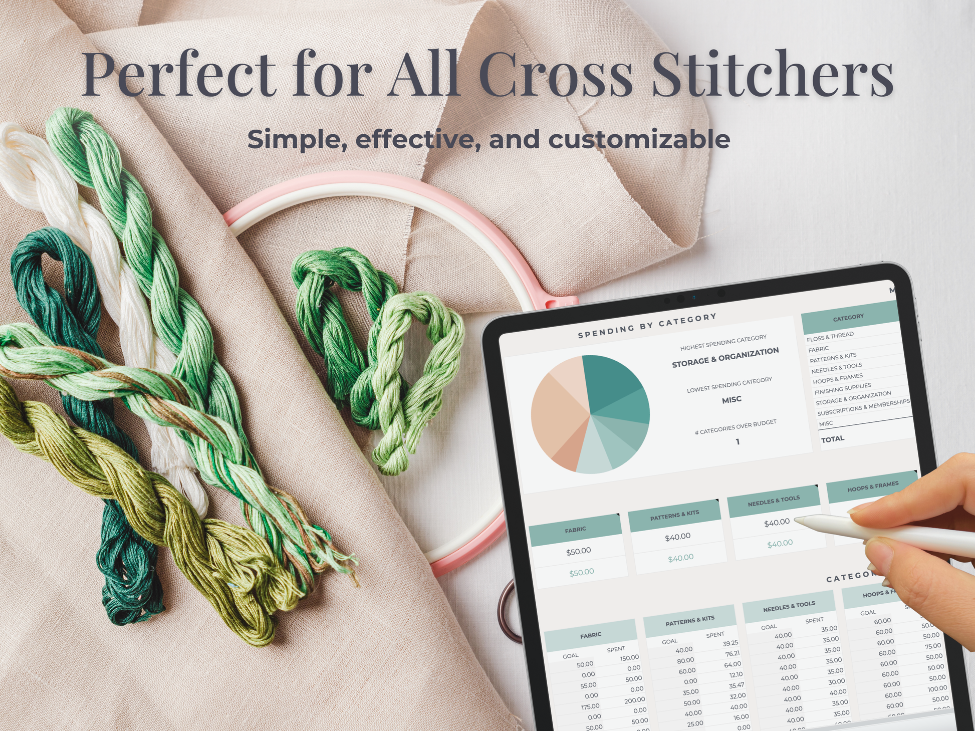 Designed for crafters who want to manage hobby expenses and track personal finances, this easy-to-use budgeting spreadsheet helps you monitor your spending over 12 months. With 10 customizable categories, you can log every purchase — from embroidery supplies to fabric and floss — and see exactly where your money is going.